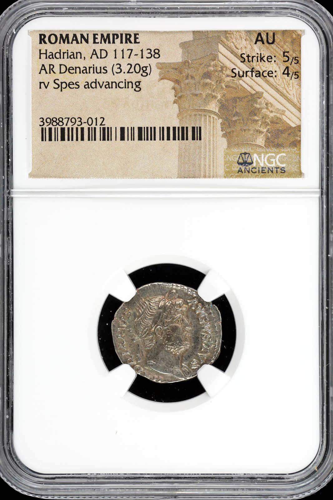 Roman Imperial Hadrian 117-138 AD AR Denarius NGC AU 33969