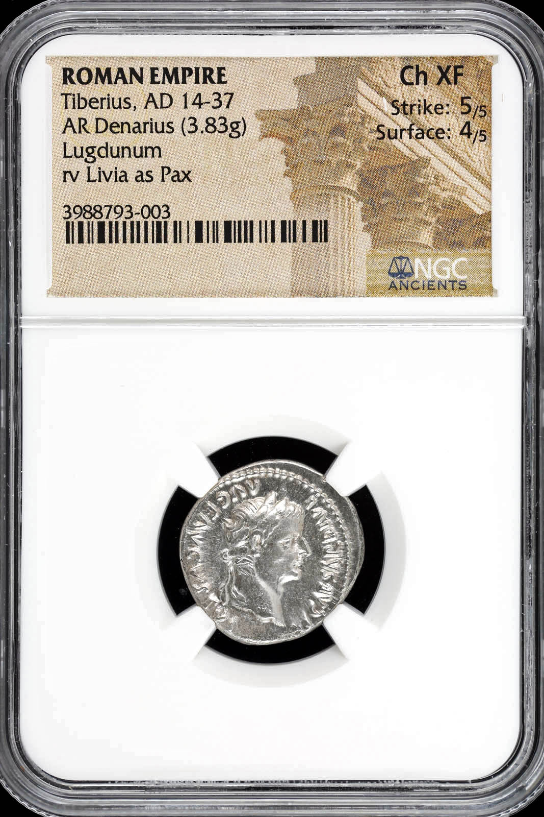 Roman Imperial Tiberius 14-37 AD Denarius NGC Ch XF 33971
