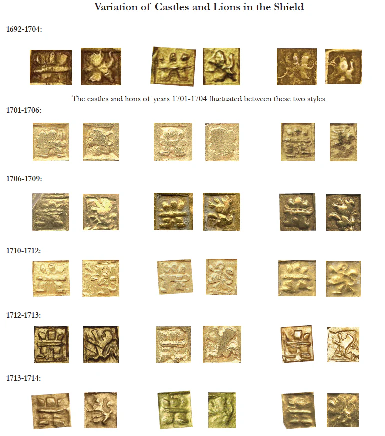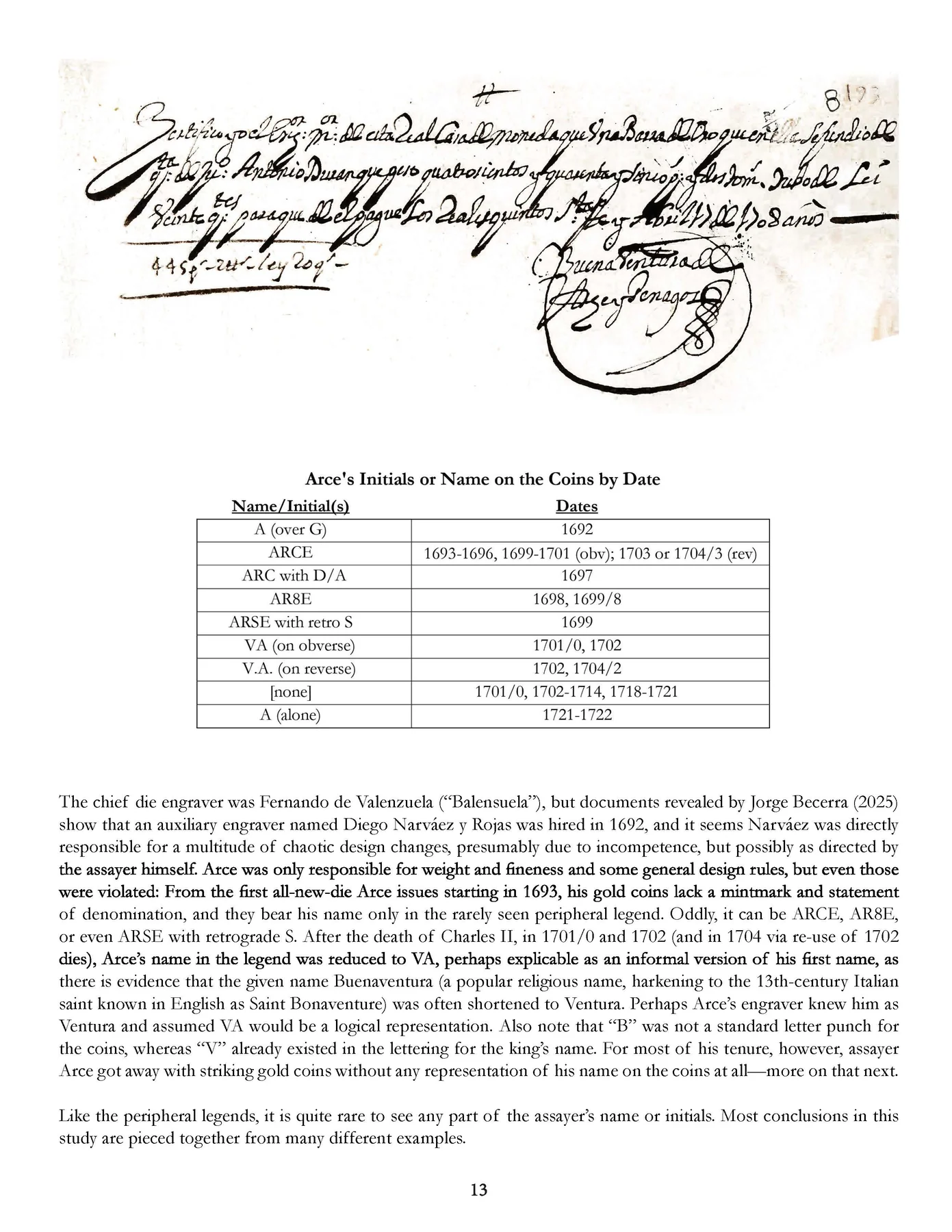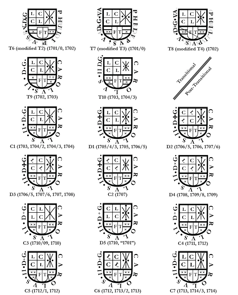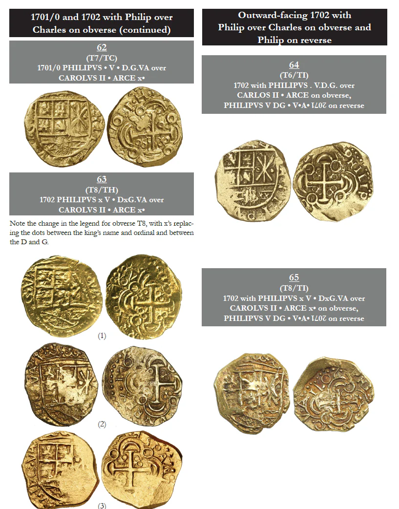 After a lengthy introduction, the coins are presented in three chapters representing distinct periods: Lifetime issues 1692-1699, Transitional issues 1700-1704, and Post-Transitional issues 1703-1714 (the overlap of the last two considered Half-Transitionals 1703-1704). Each chapter shows diagrams of the obverse (shield) die designs and key aspects of the reverse (cross) die designs, with summaries and photos of all the known die combinations. Two appendices do the same for Philip V Arce 2 escudos 1718-1722 and all Arce 1 escudos 1692-1722.