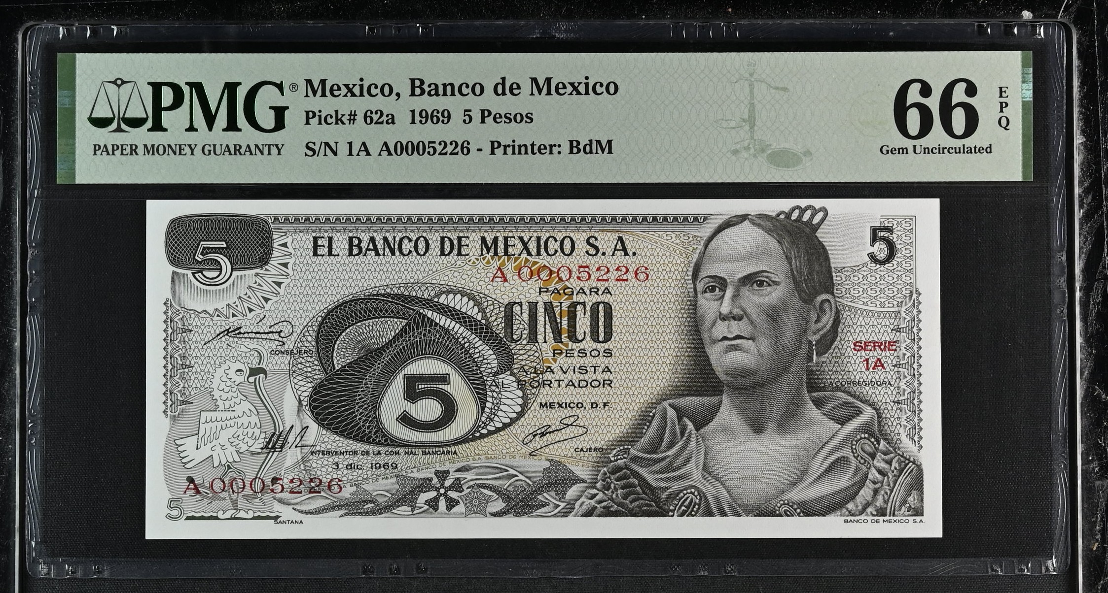 Banco De Mexico 5 Pesos 1969 Pick #62a PMG Gem UNC66 EPQ f_35385
