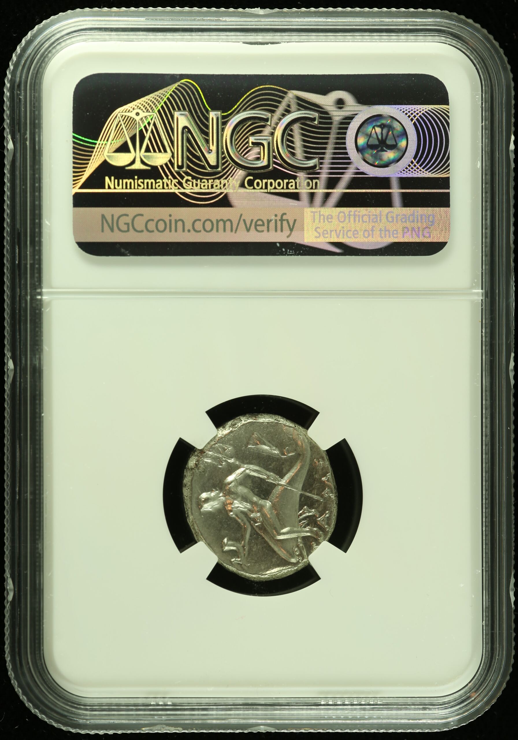 City: TarasDate: c.302-280 BCDenom: DidrachmMetal: ARWeight: (7.85g)Grade: NGC AUGrading Strike: 4/5Grading Surface: 4/5 -