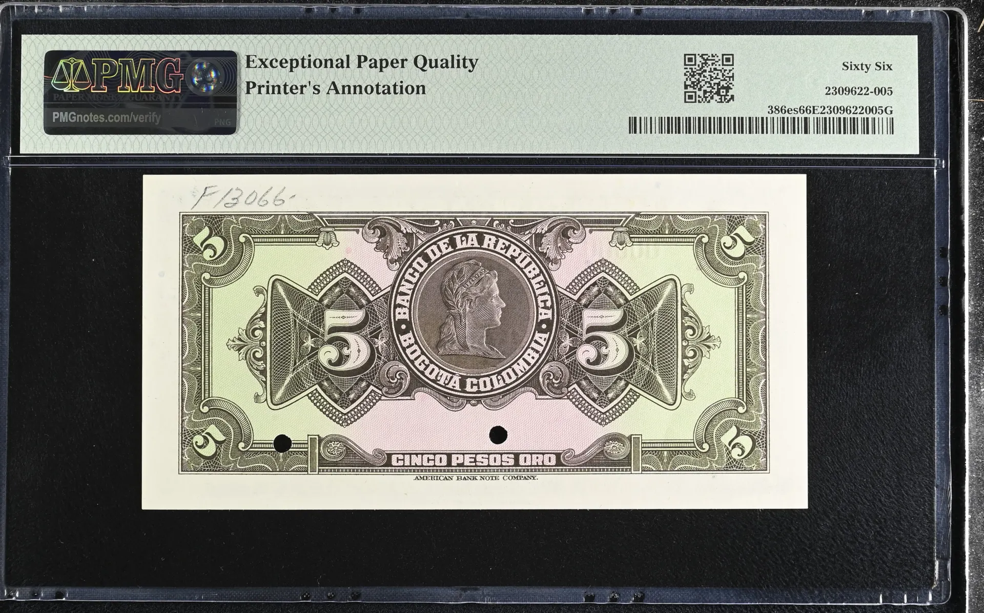 Colombia 5 Pesos Oro 1950 PMG Gem UNC66 EPQ Pick #386es 0152329