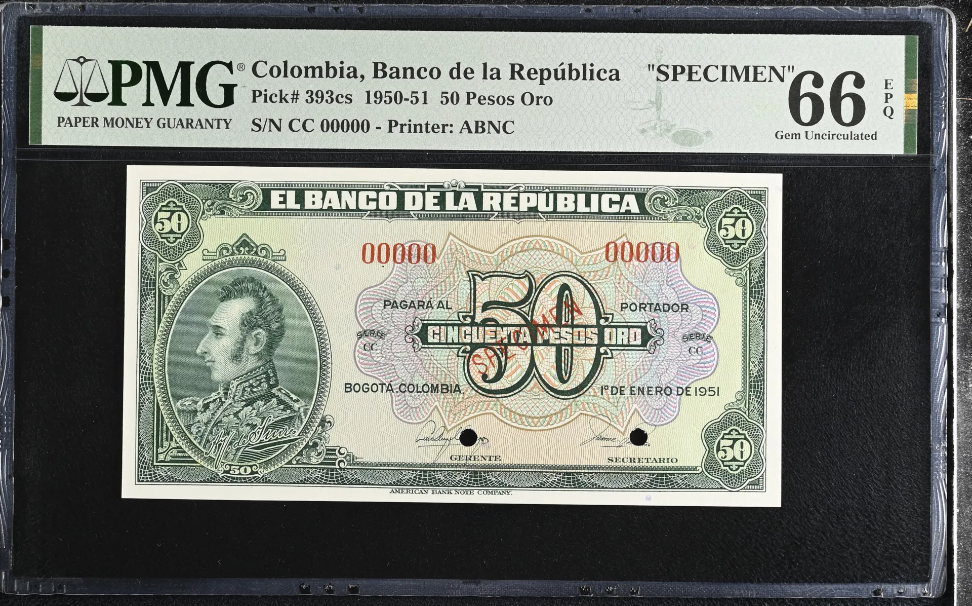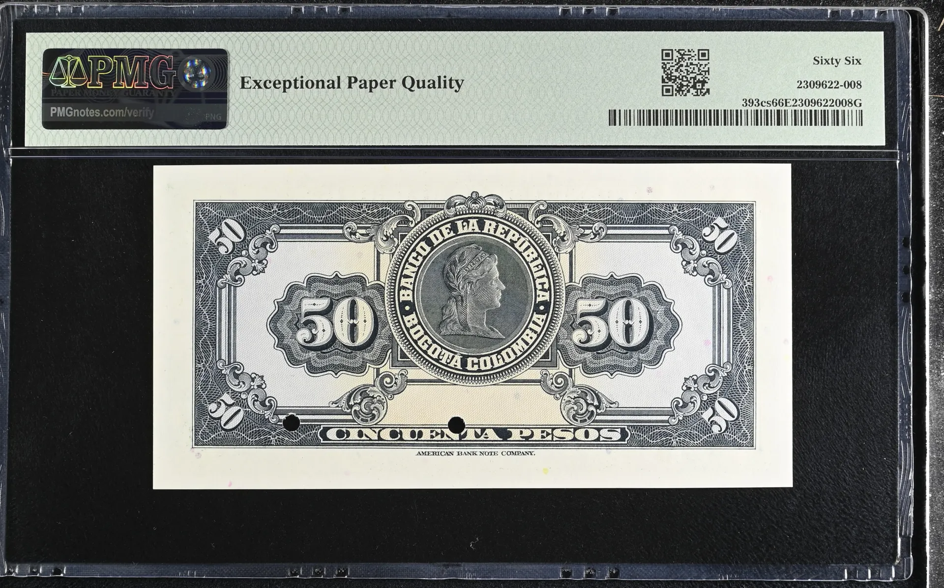 Colombia 50 Pesos Oro 1951 PMG Gem UNC66 EPQ Pick #393cs 0152332