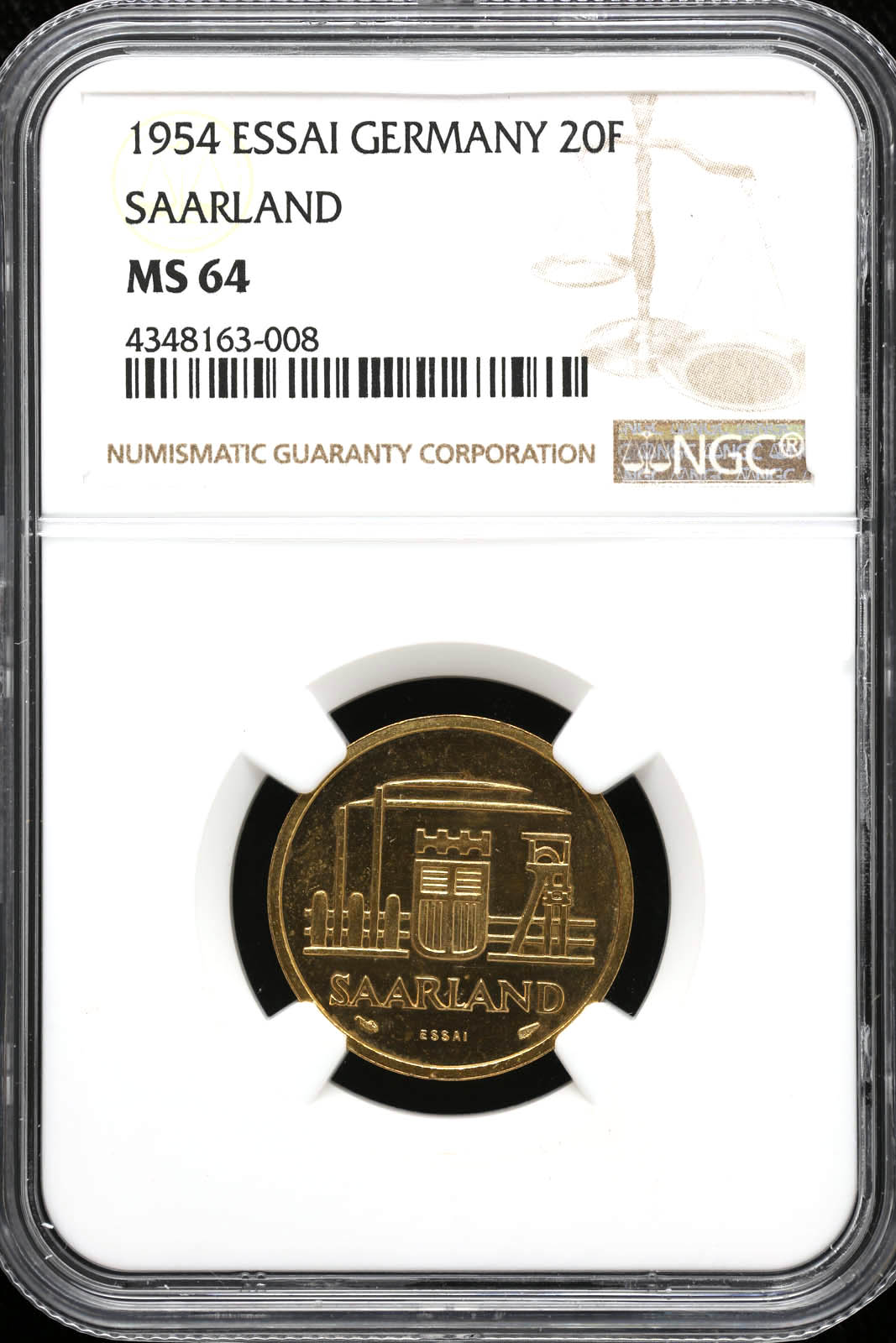 Germany- Saarland 20 Franken 1954 NGC MS64 KM E3 34262