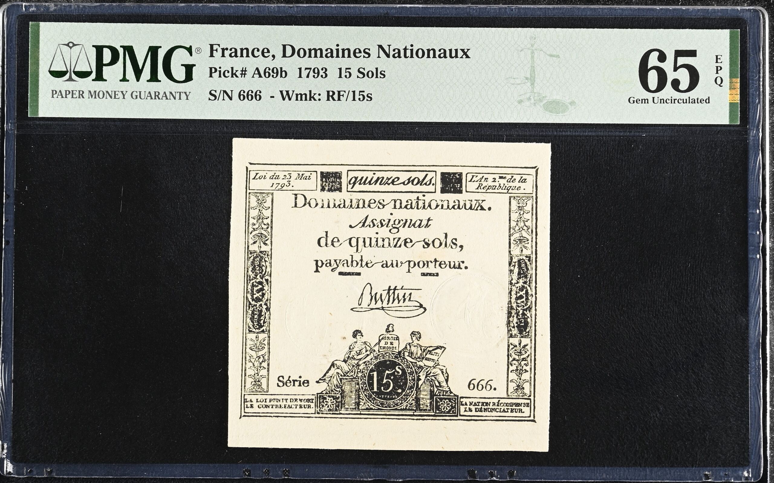 France 15 Sols 1793 Pick# A69b PMG Gem UNC65 EPQ 0155681