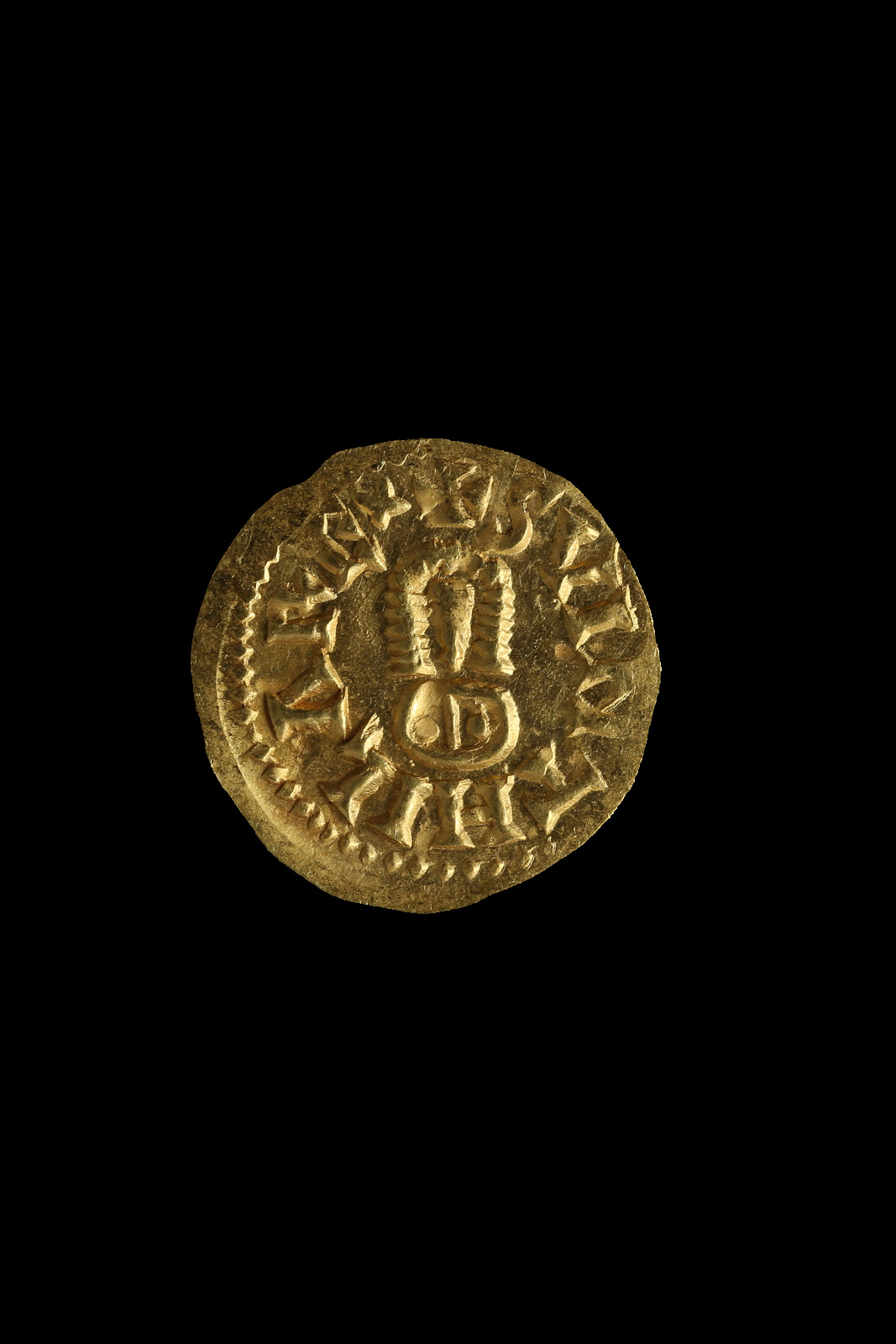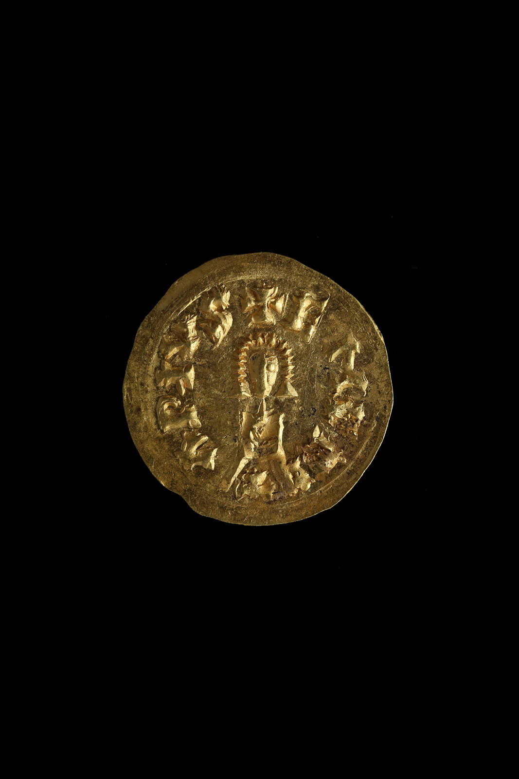 VISIGOTHS in Spain. Swinthila (Suinthila). 621-631 AD. AV Tremissis. Emerita (Merida) mint. Sharply struck mint state, with crudely cut letters, resembling double-strike.