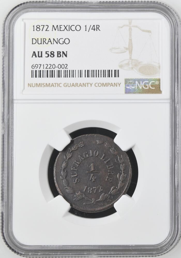 Republic Silver & Minors 1/4 Real 1872 Durango NGC AU58BN 0144995