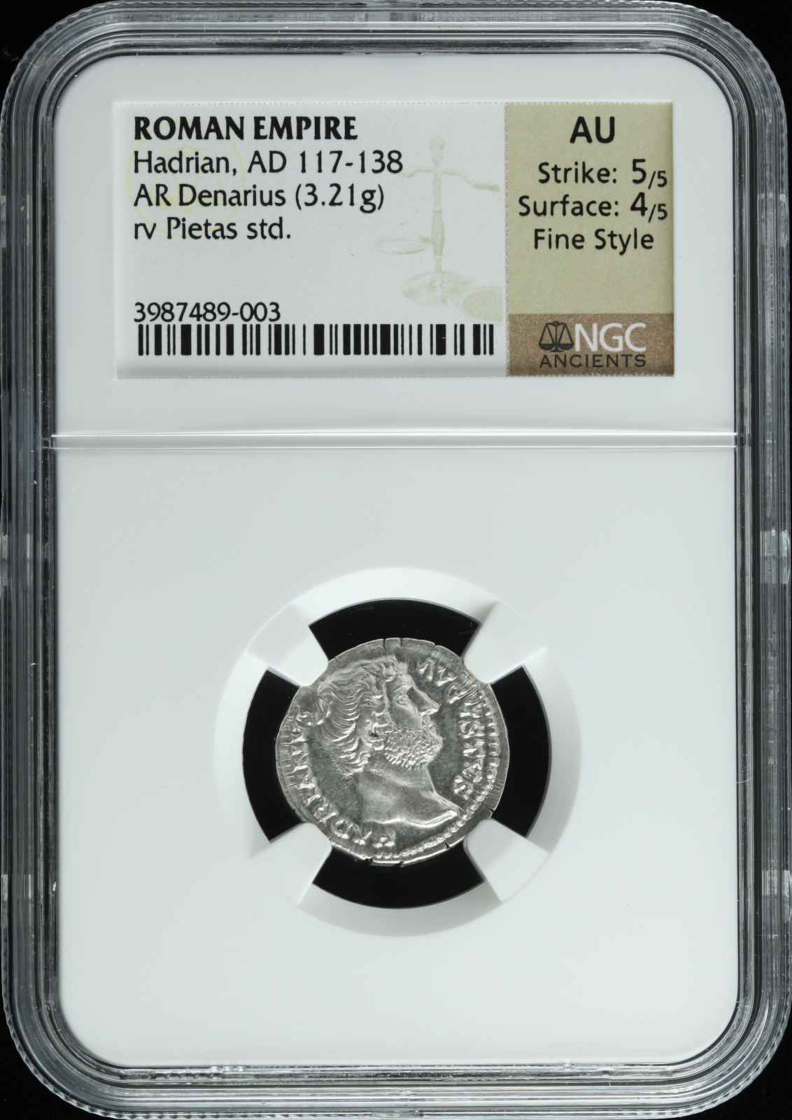 Roman Empire Hadrian 117-138 AD AR Denarius NGC AU