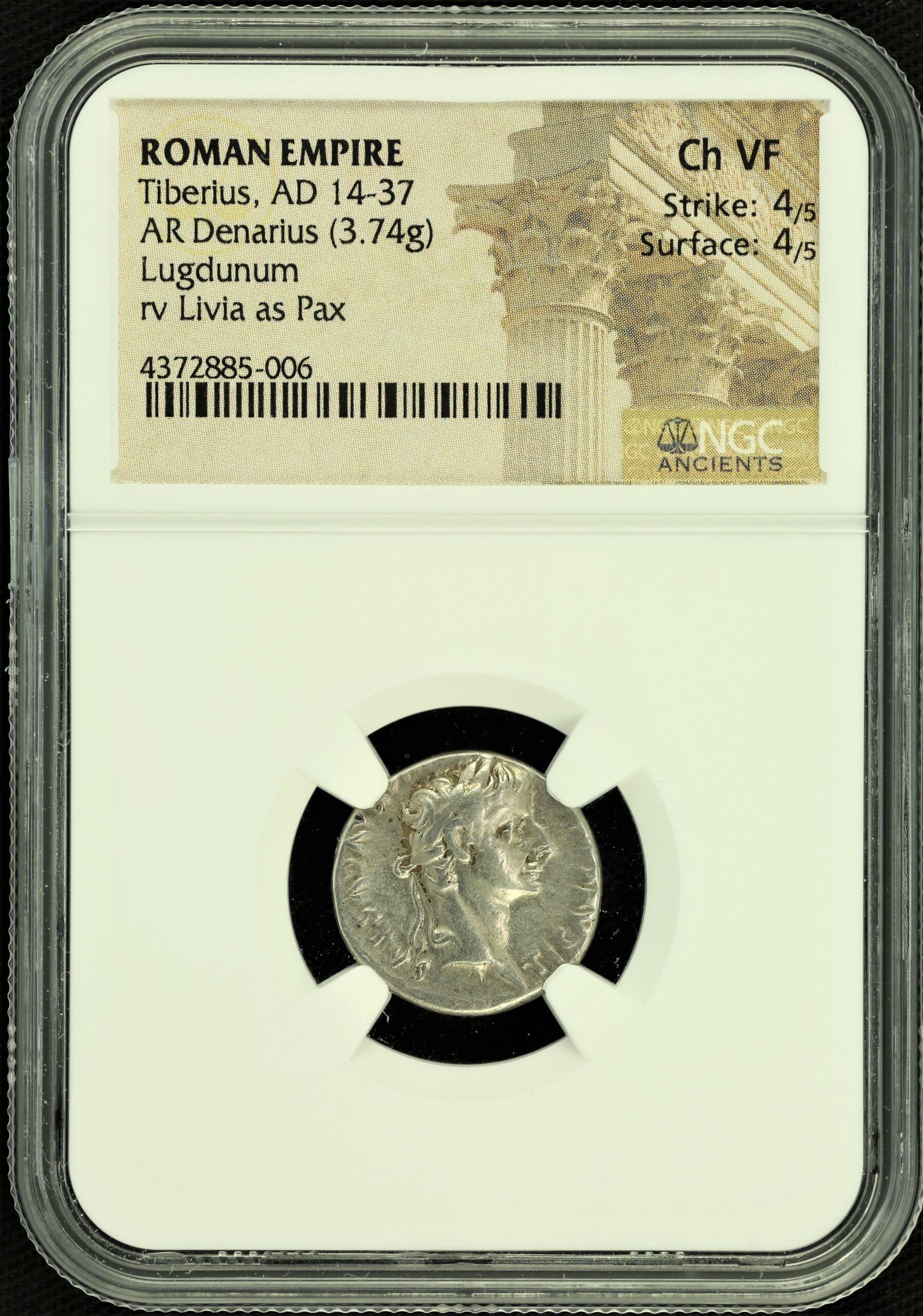 Roman Imperial Lugdunum Tiberius 14-37 AD AR Denarius NGC Ch VF 39645