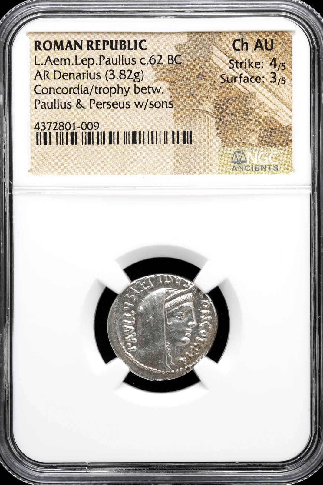 Roman Republic L. Aemilius Lepidus Paullus c.62 BC AV Denarius NGC Ch AU 34289